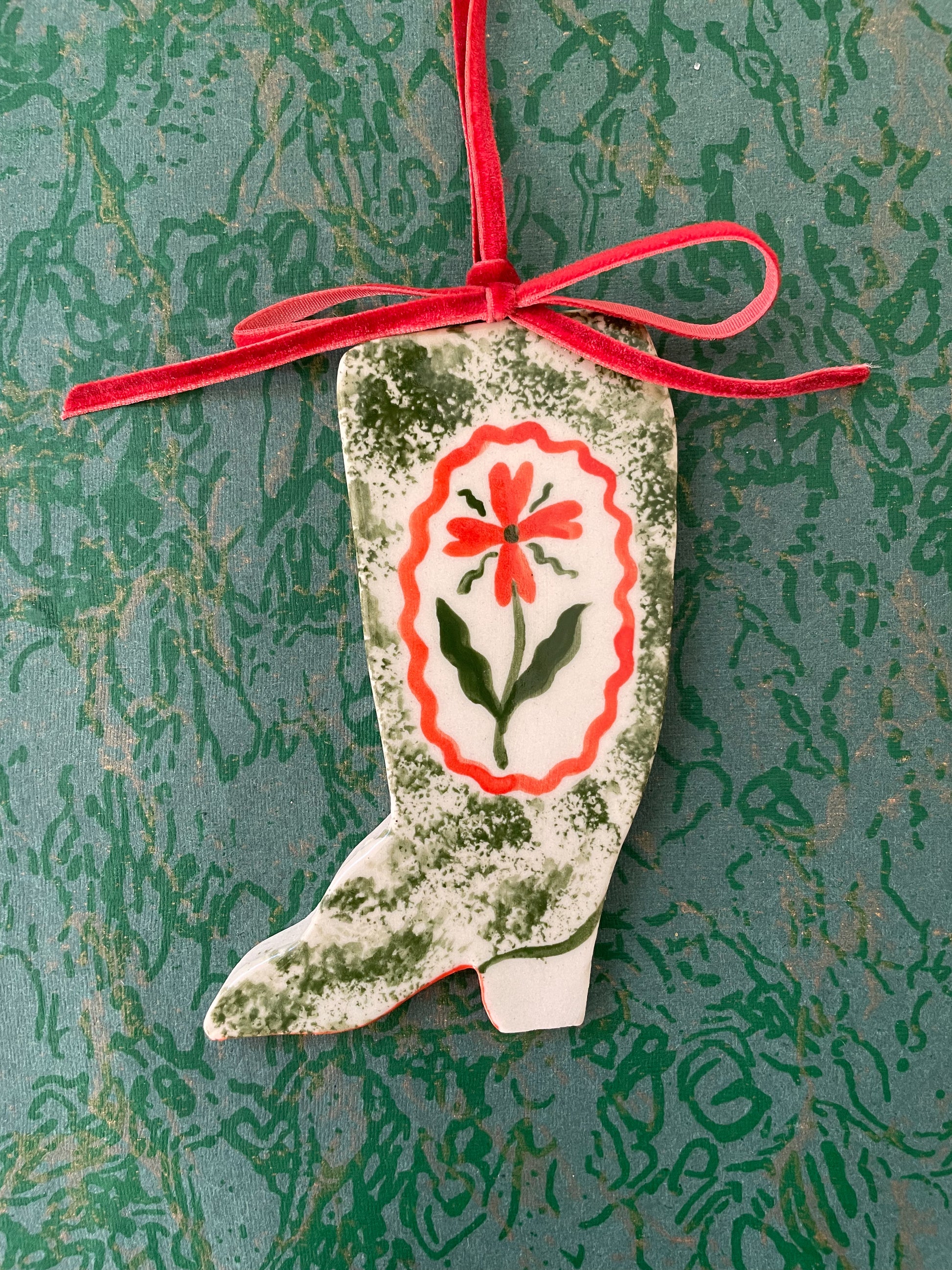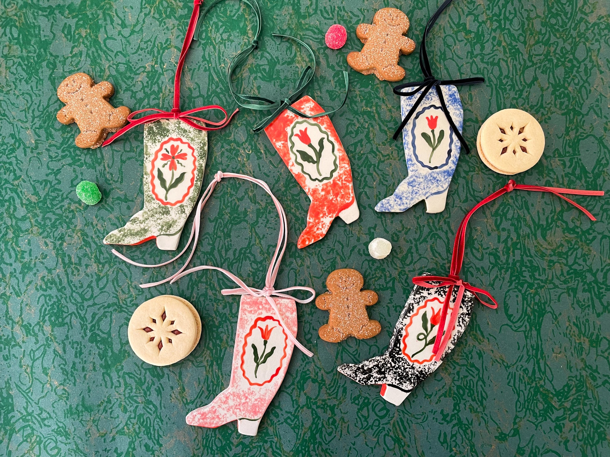 how they’re made: sculpted out of white stoneware, hand painted, glazed with a glossy clear coat and fired twice. Artist signature on the back. velvet ribbon hangers and bows attached.
