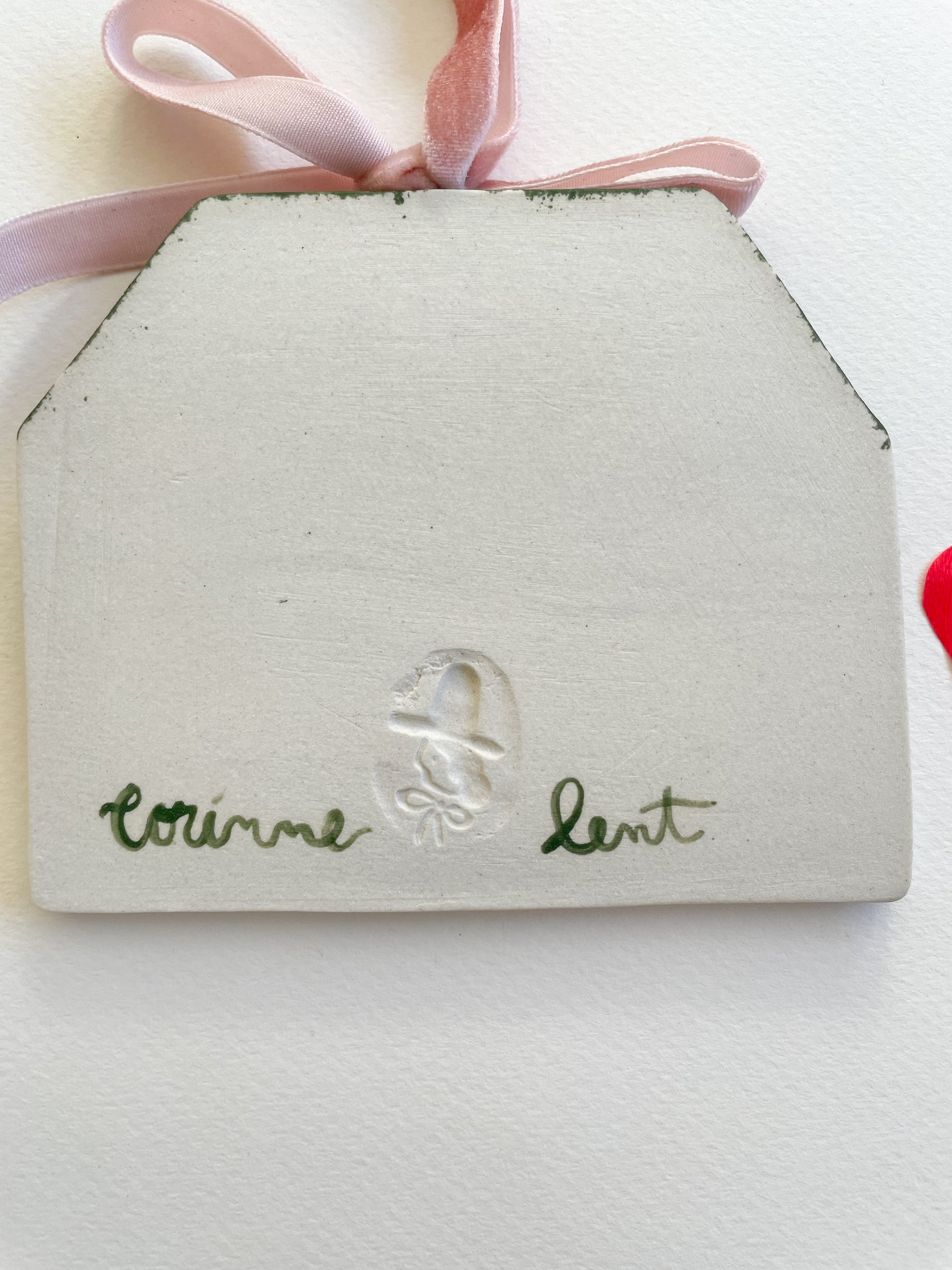 how they’re made: sculpted out of white stoneware, hand painted, glazed with a glossy clear coat and fired twice. Artist signature on the back. velvet ribbon hangers and bows attached.