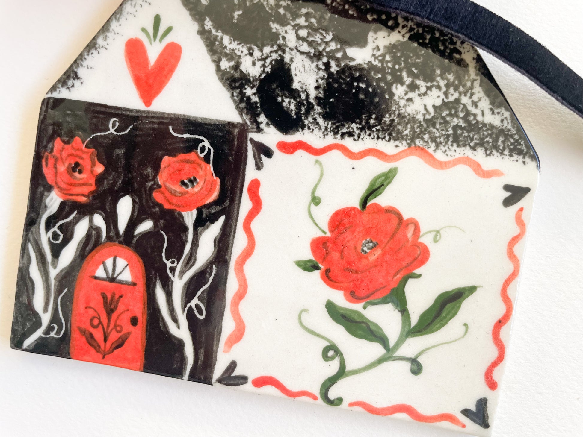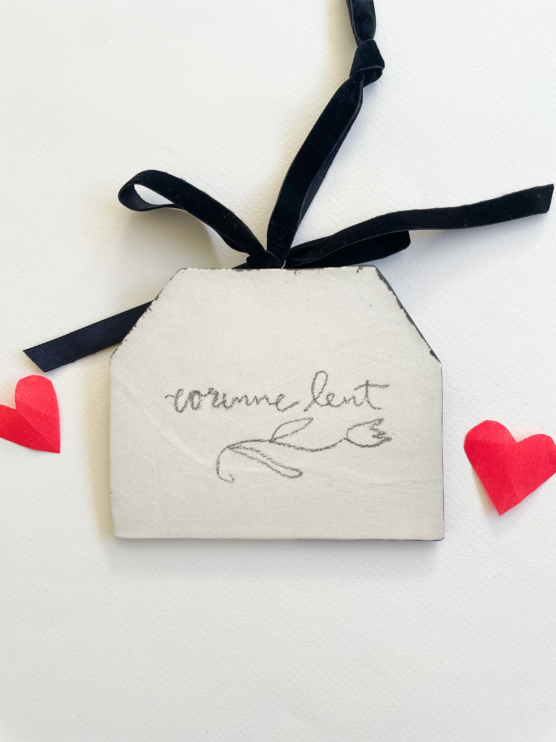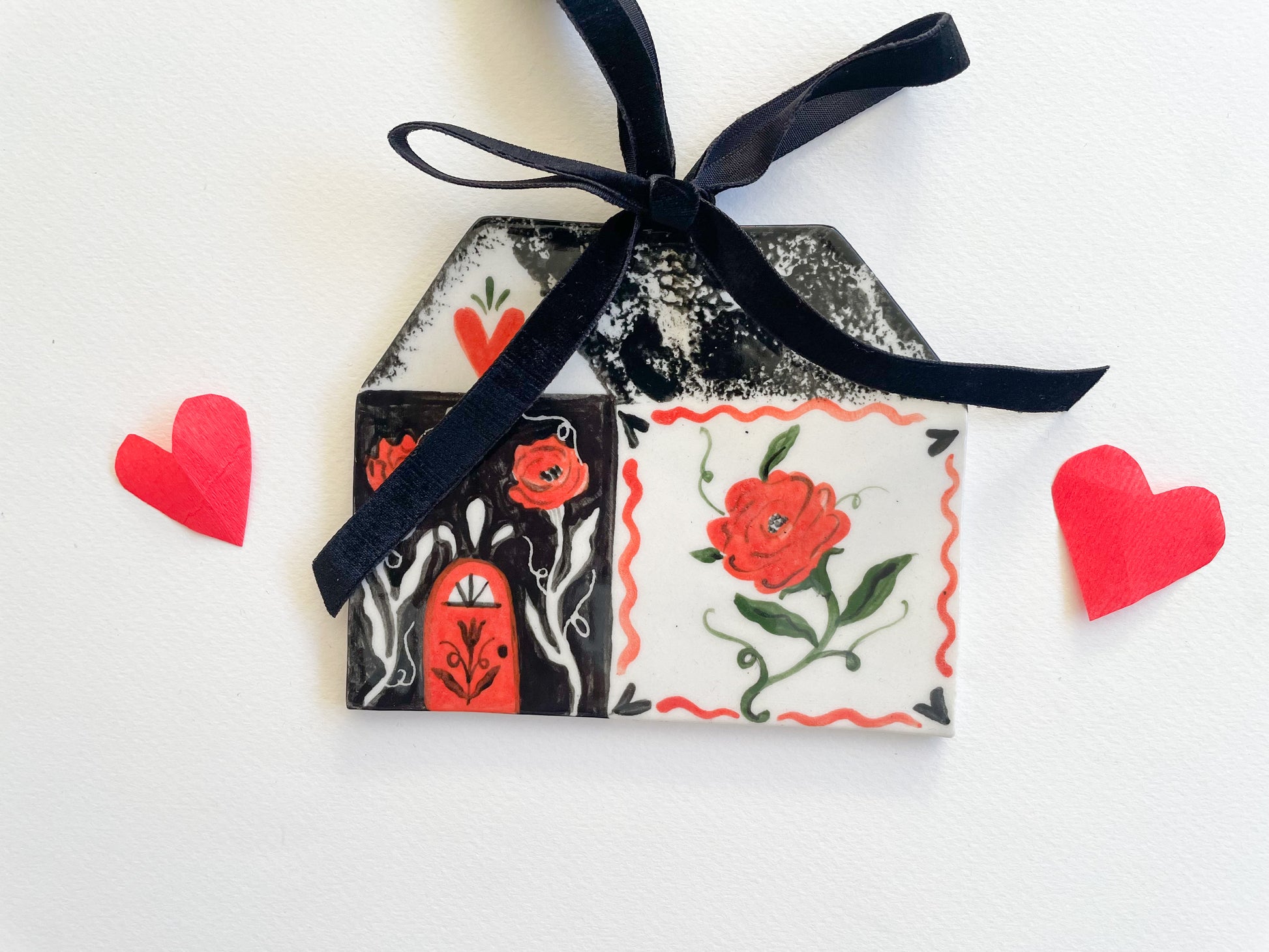 how they’re made: sculpted out of white stoneware, hand painted, glazed with a glossy clear coat and fired twice.  Artist signature on the back. velvet ribbon hangers and bows attached.