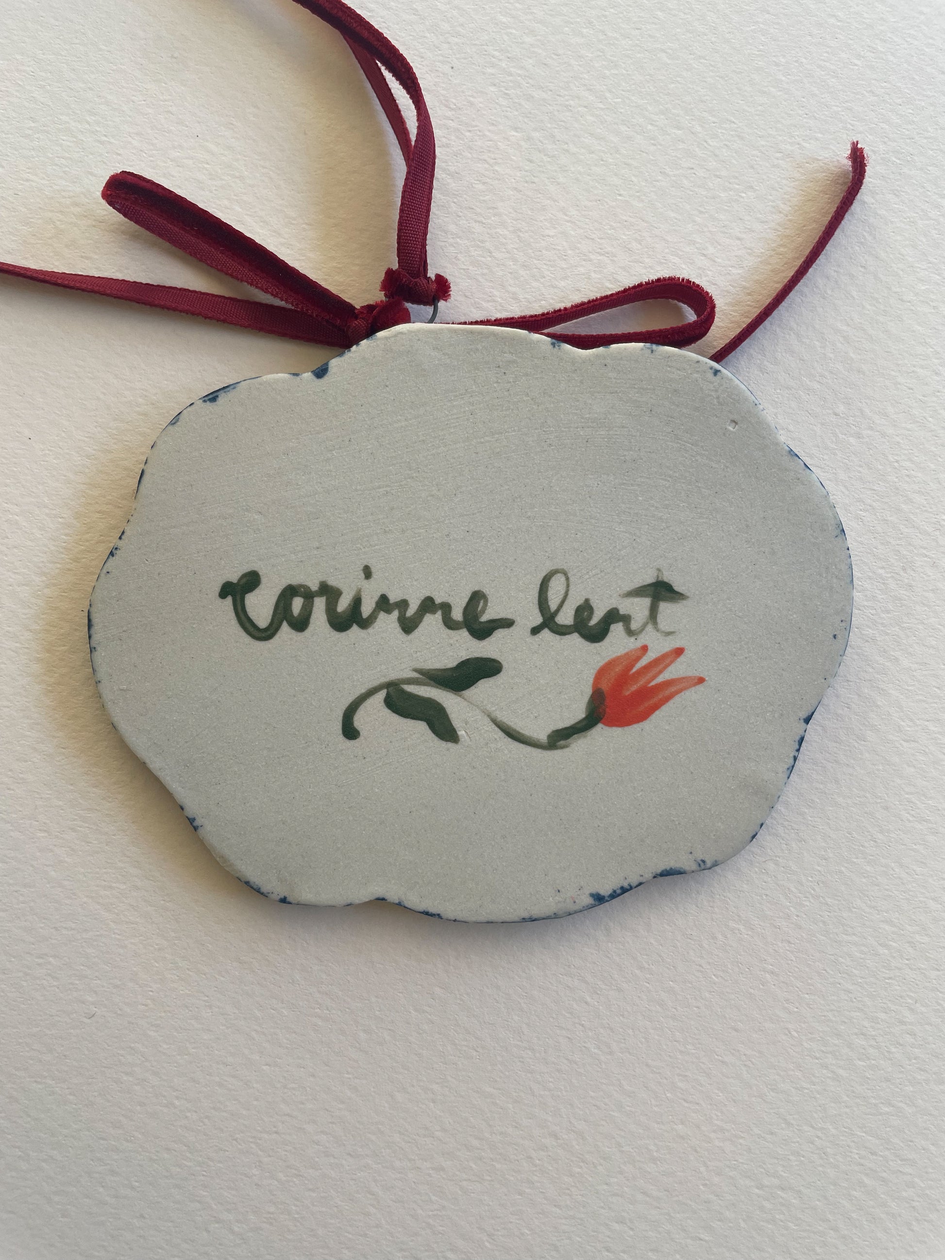 how they’re made: sculpted out of white stoneware, hand painted, glazed with a glossy clear coat and fired twice. Artist signature on the back. velvet ribbon hangers and bows attached.