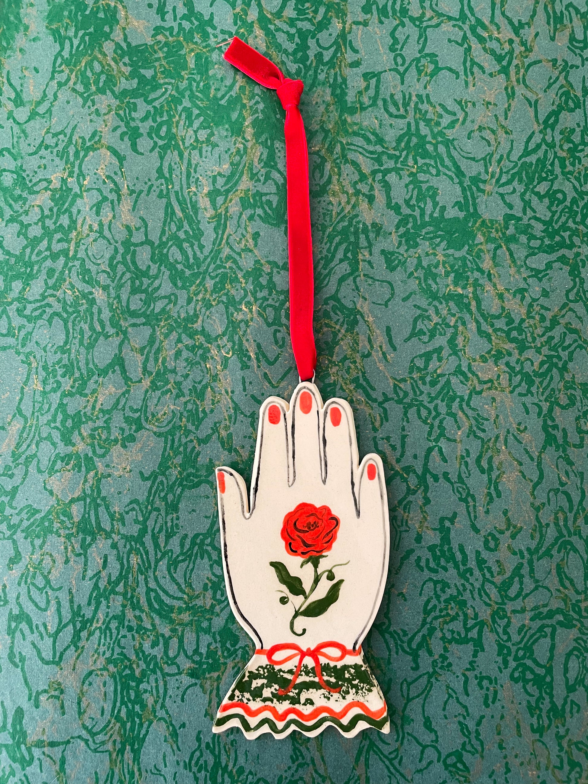 how they’re made: sculpted out of white stoneware, hand painted, glazed with a glossy clear coat and fired twice.  Artist signature on the back. velvet ribbon hangers and bows attached.