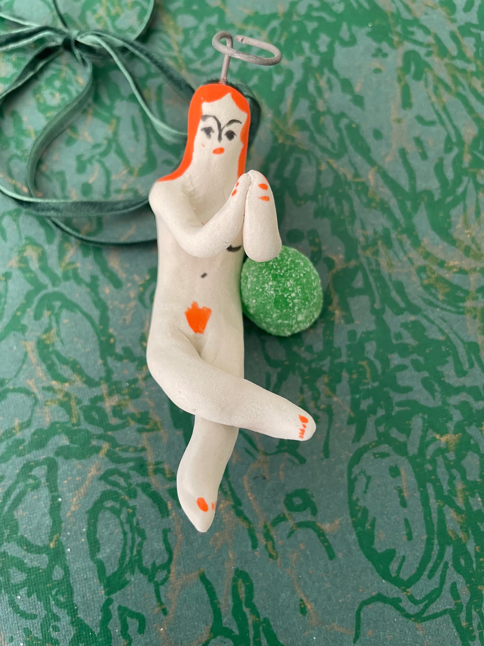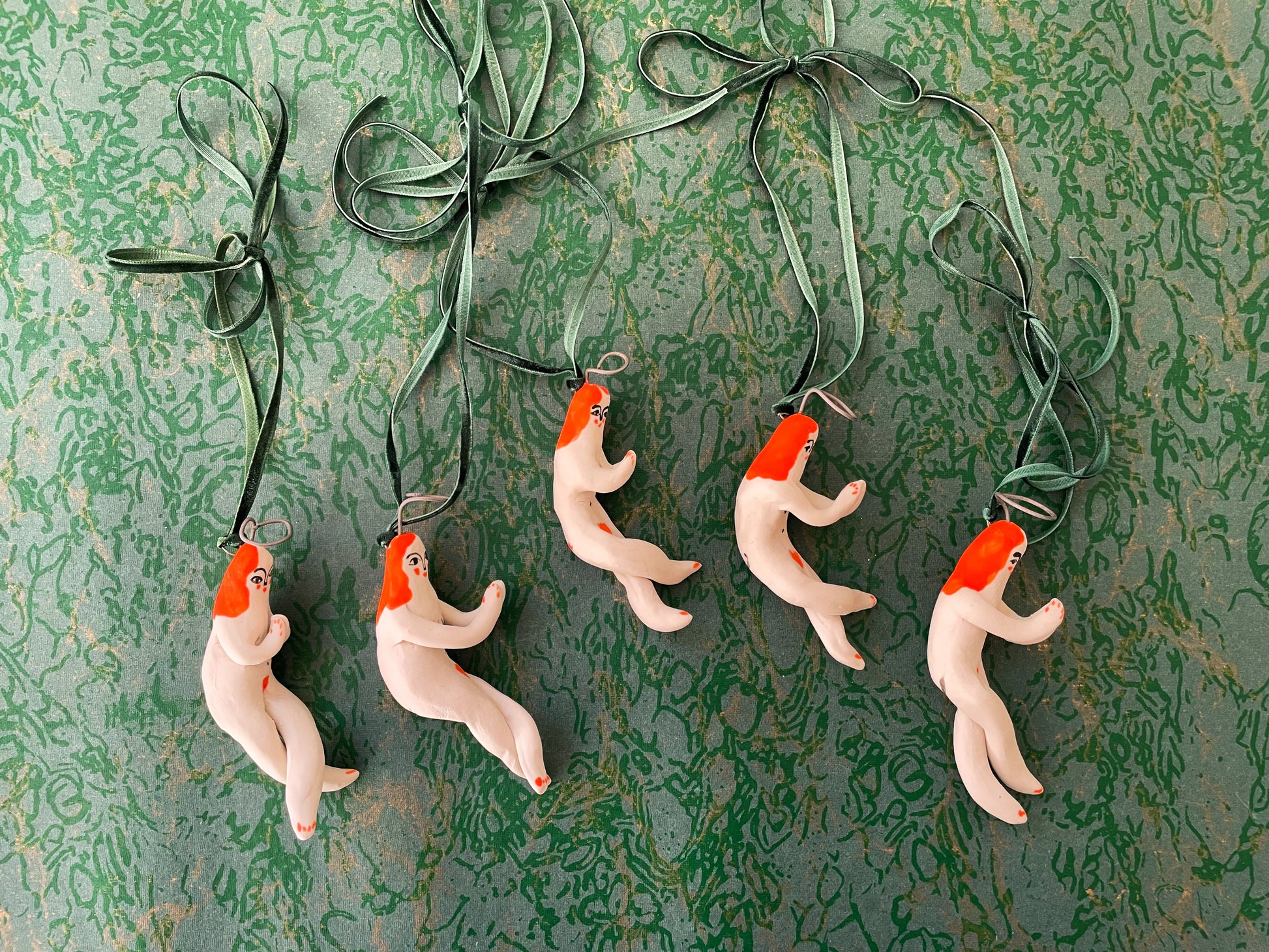 how they’re made: sculpted out of white stoneware, hand painted, glazed with a glossy clear coat and fired twice. Artist signature on the back. velvet ribbon hangers and bows attached.