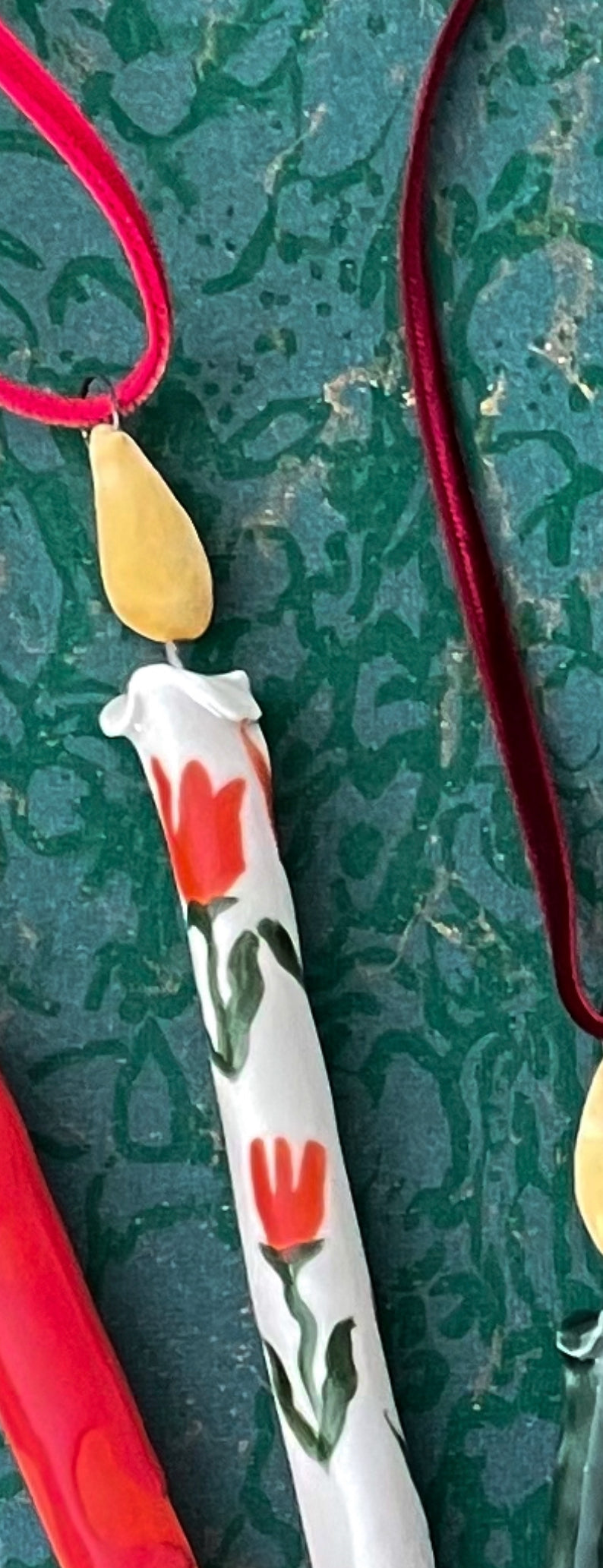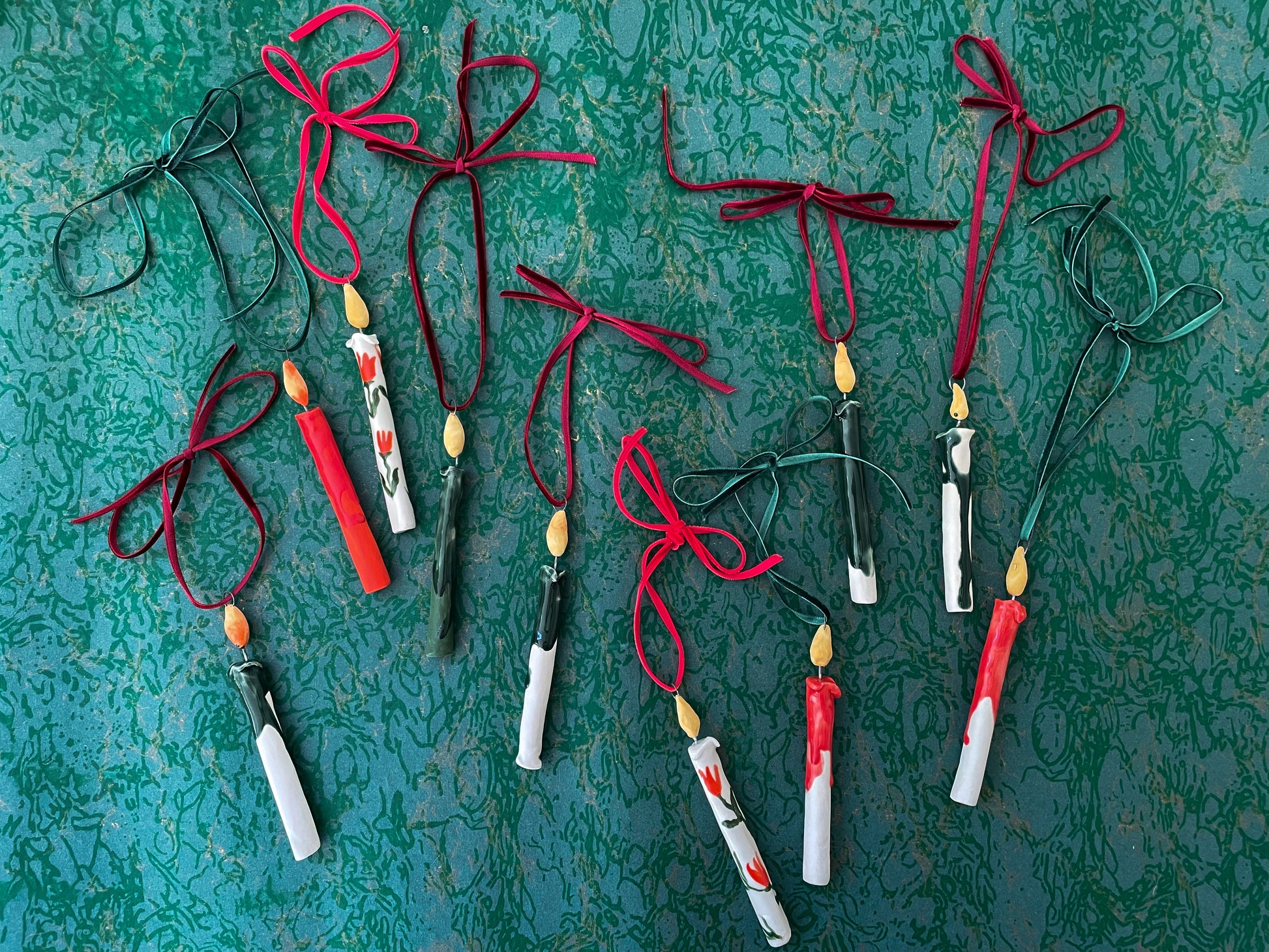 how they’re made: sculpted out of white stoneware, hand painted, glazed with a glossy clear coat and fired twice. Artist signature on the back. velvet ribbon hangers and bows attached.