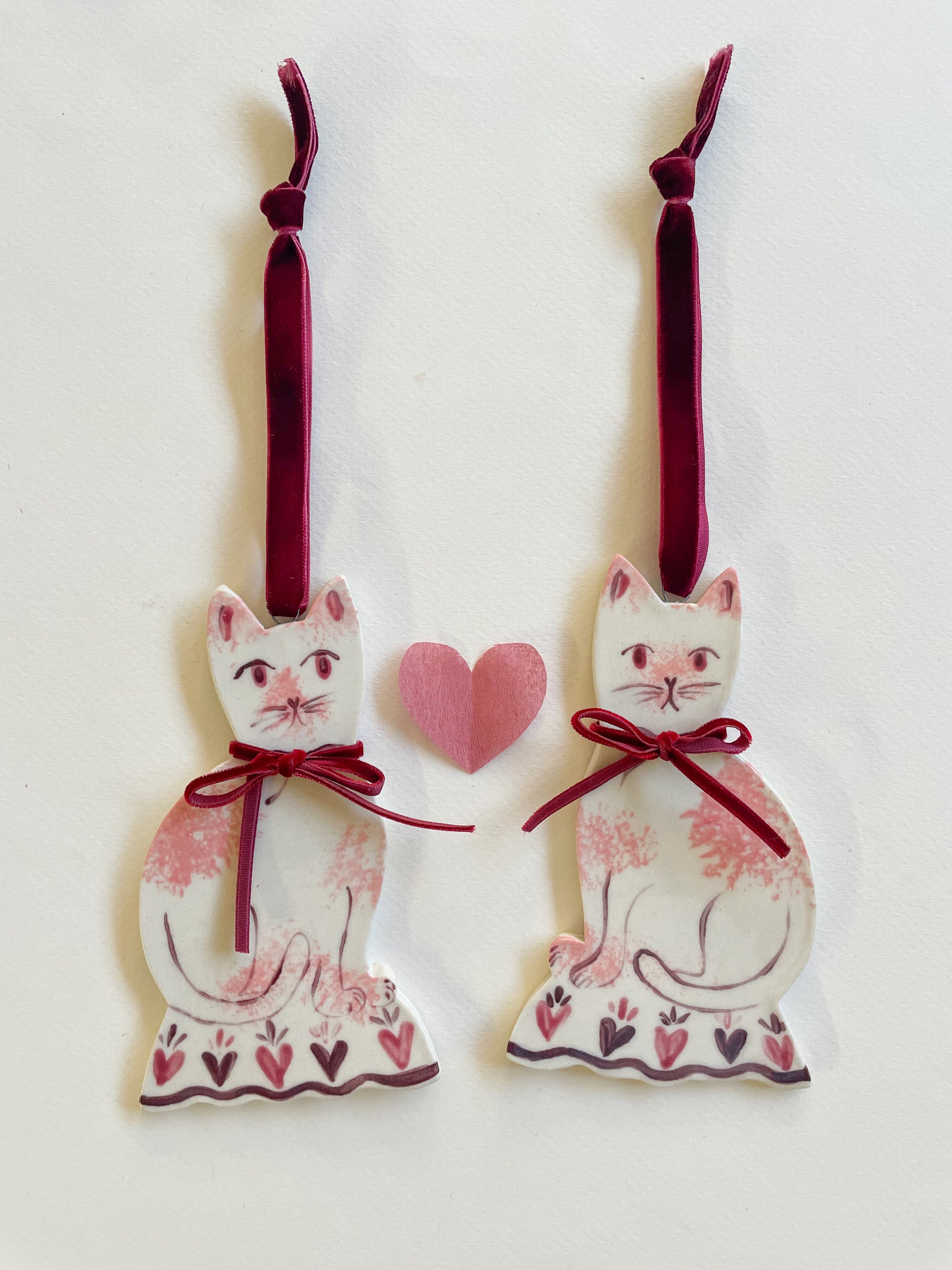 how they’re made: sculpted out of white stoneware, hand painted, glazed with a glossy clear coat and fired twice. Artist signature on the back. velvet ribbon hangers and bows attached.