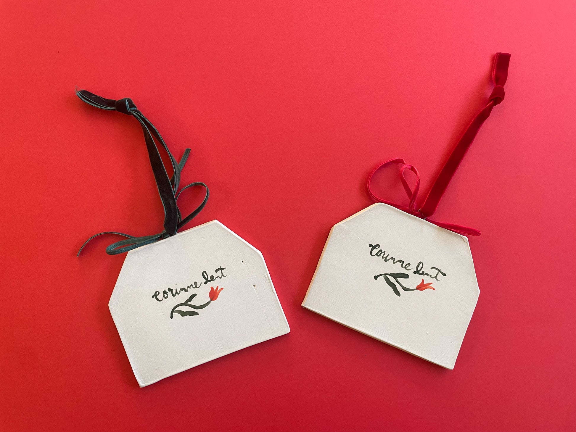 how they’re made: sculpted out of white stoneware, hand painted, glazed with a glossy clear coat and fired twice. Artist signature on the back. velvet ribbon hangers and bows attached.