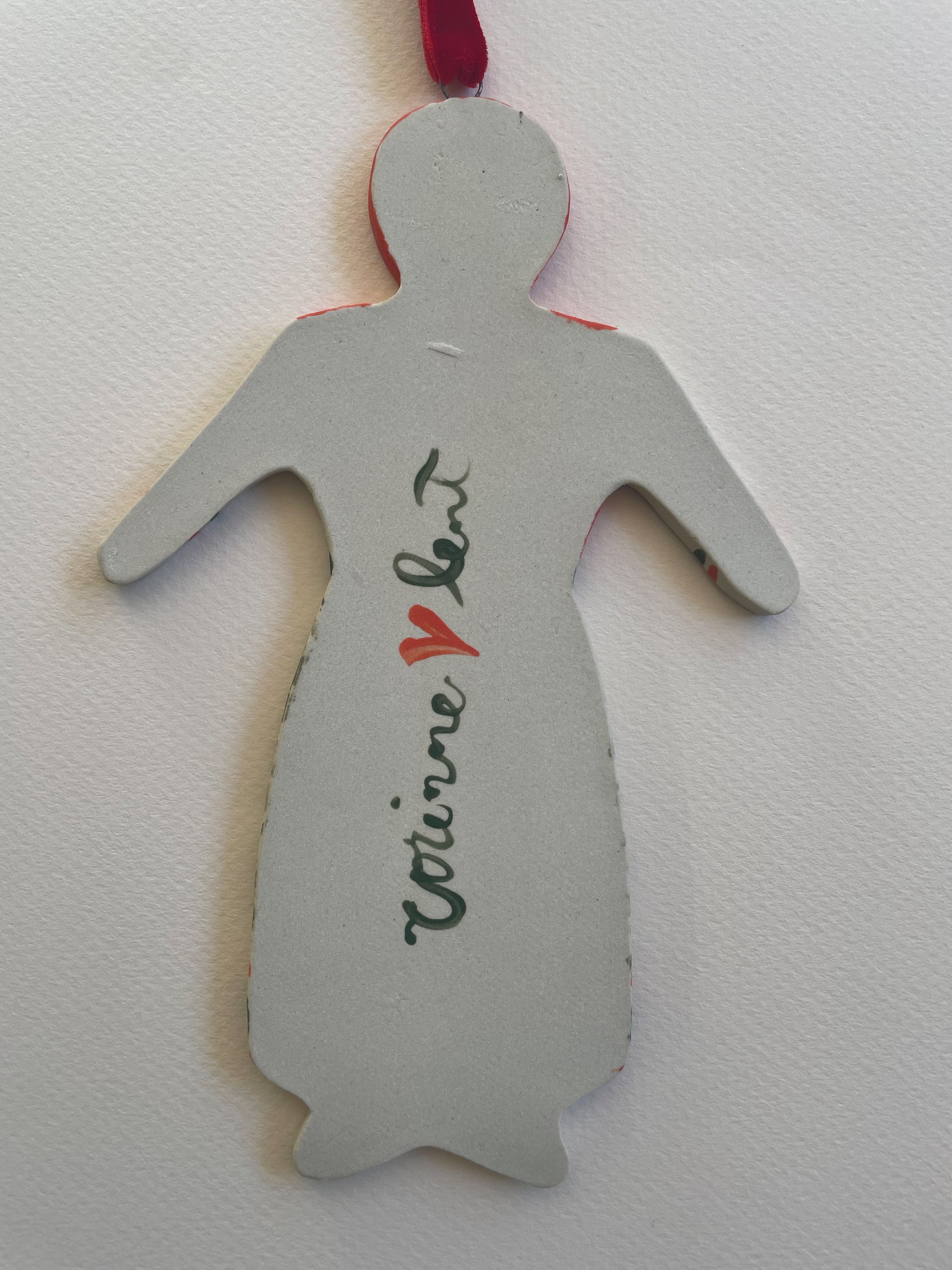 how they’re made: sculpted out of white stoneware, hand painted, glazed with a glossy clear coat and fired twice. Artist signature on the back. velvet ribbon hangers and bows attached.