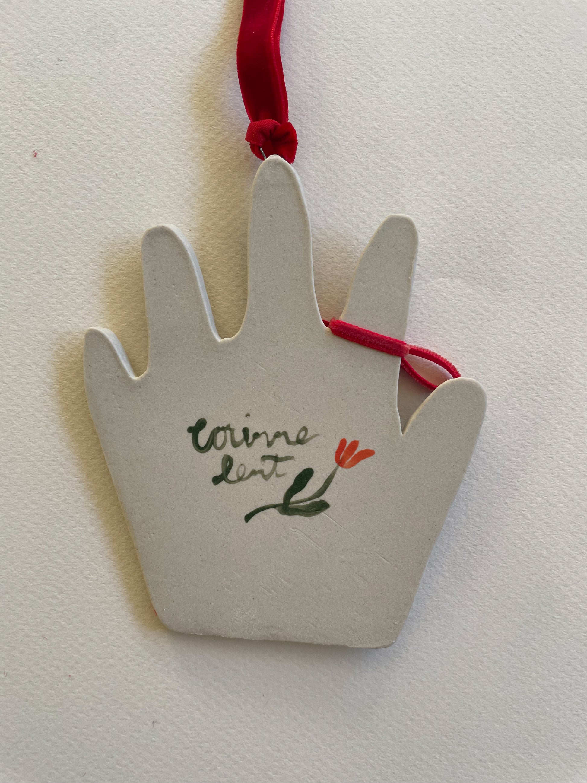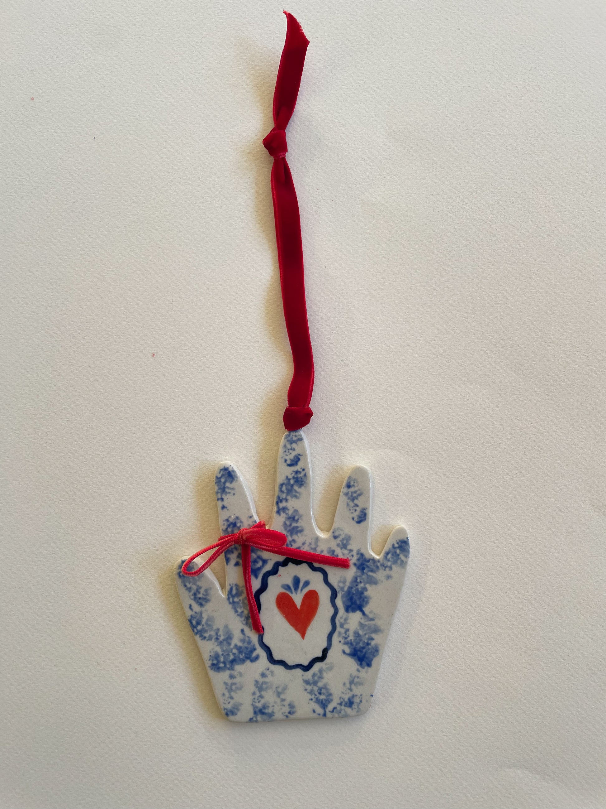 how they’re made: sculpted out of white stoneware, hand painted, glazed with a glossy clear coat and fired twice. Artist signature on the back. velvet ribbon hangers and bows attached.