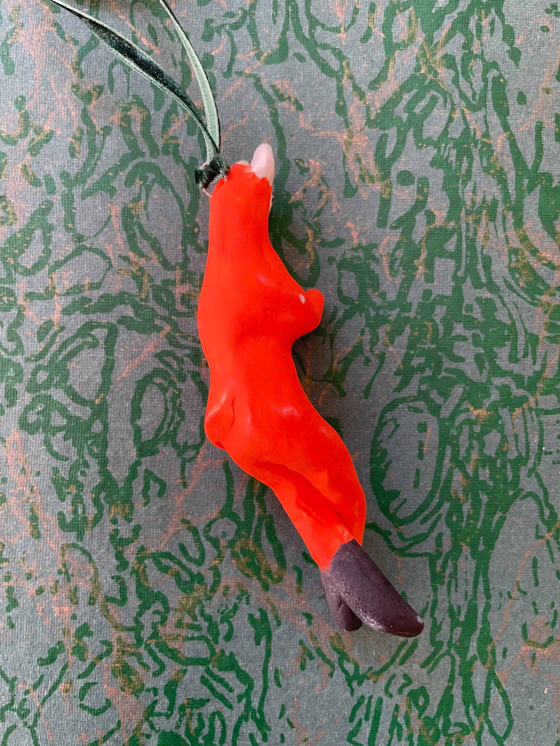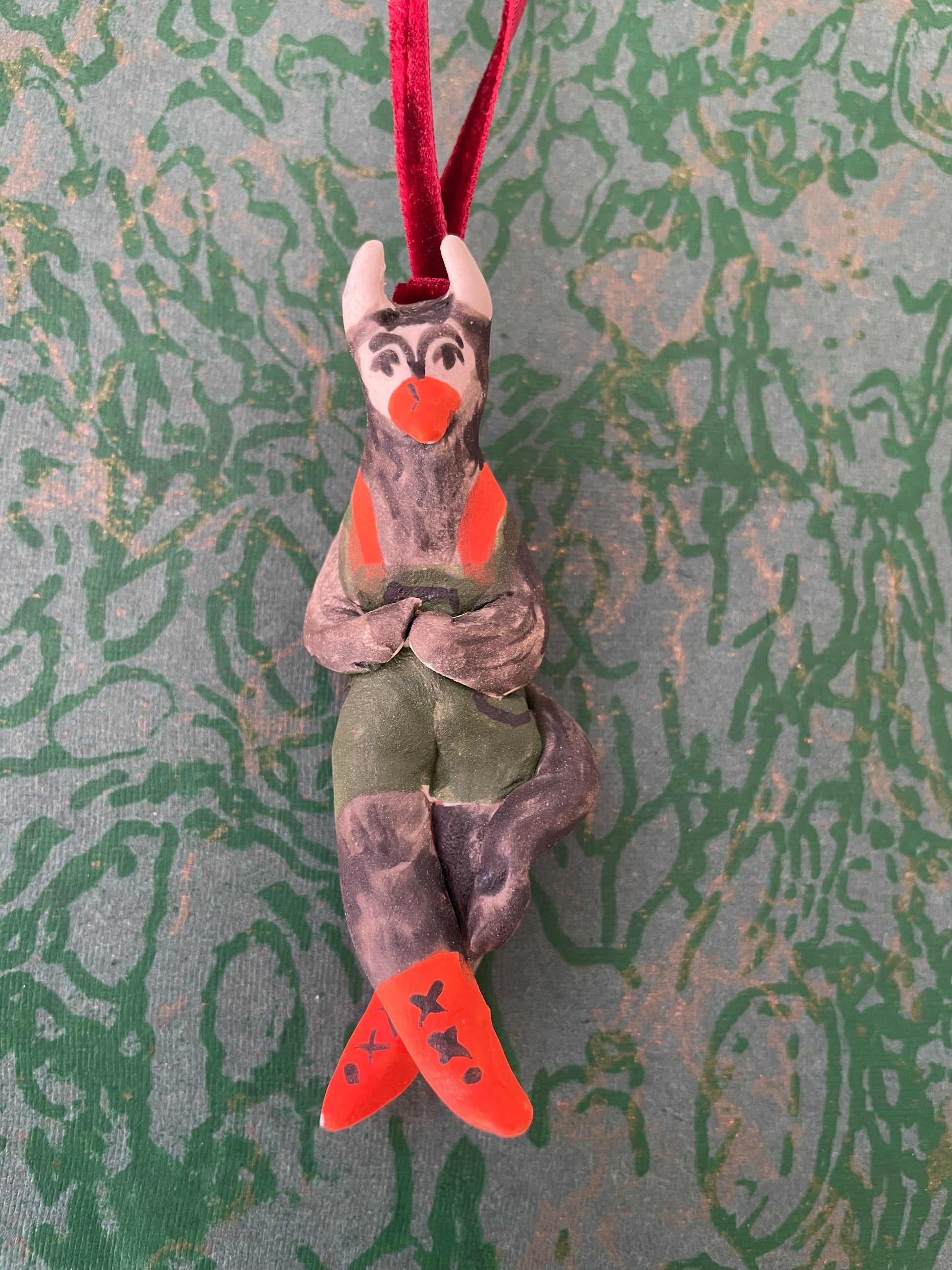 how they’re made: sculpted out of white stoneware, hand painted, glazed with a glossy clear coat and fired twice. Artist signature on the back. velvet ribbon hangers and bows attached.