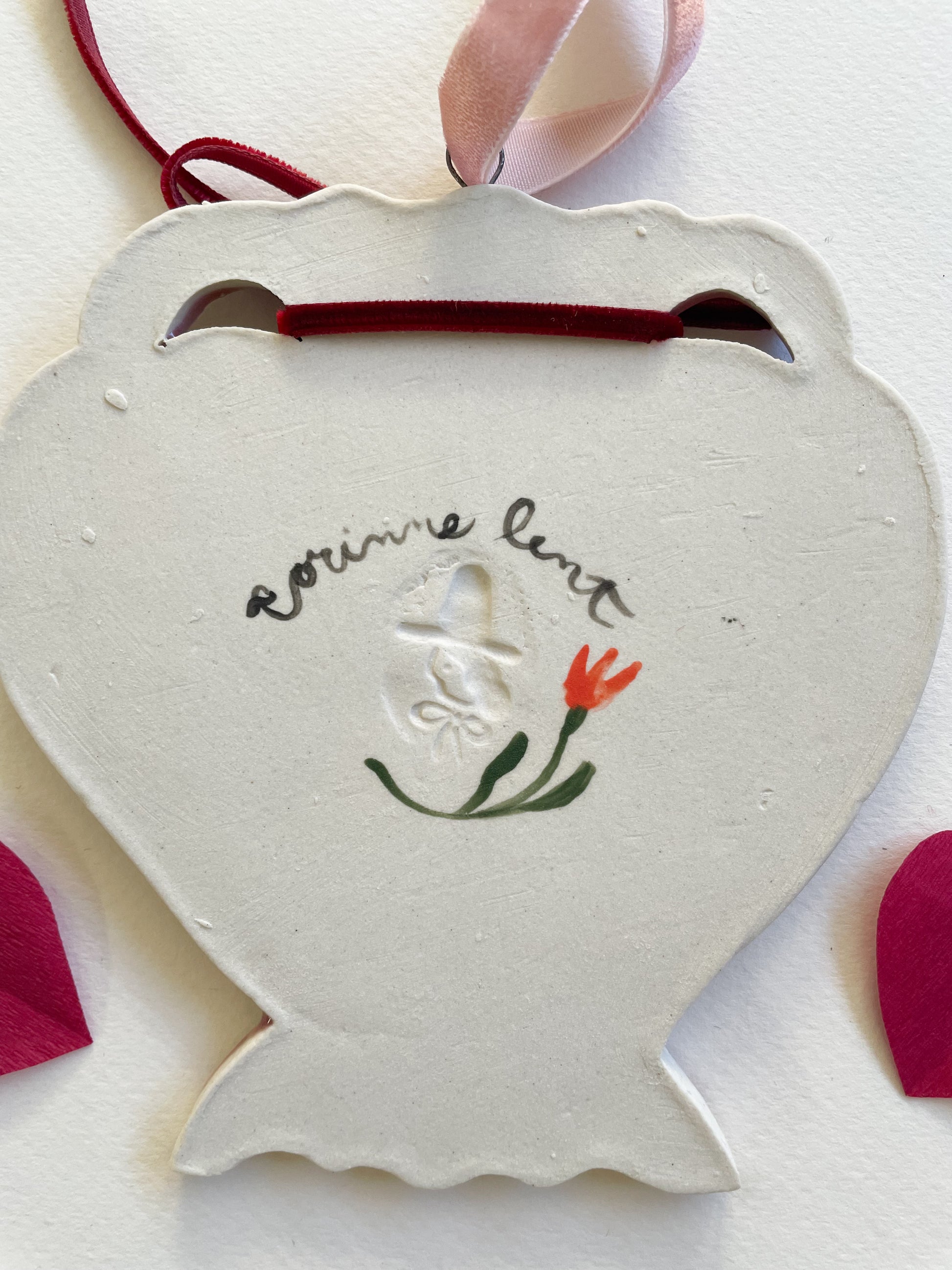 how they’re made: sculpted out of white stoneware, hand painted, glazed with a glossy clear coat and fired twice.  Artist signature on the back. velvet ribbon hangers and bows attached.