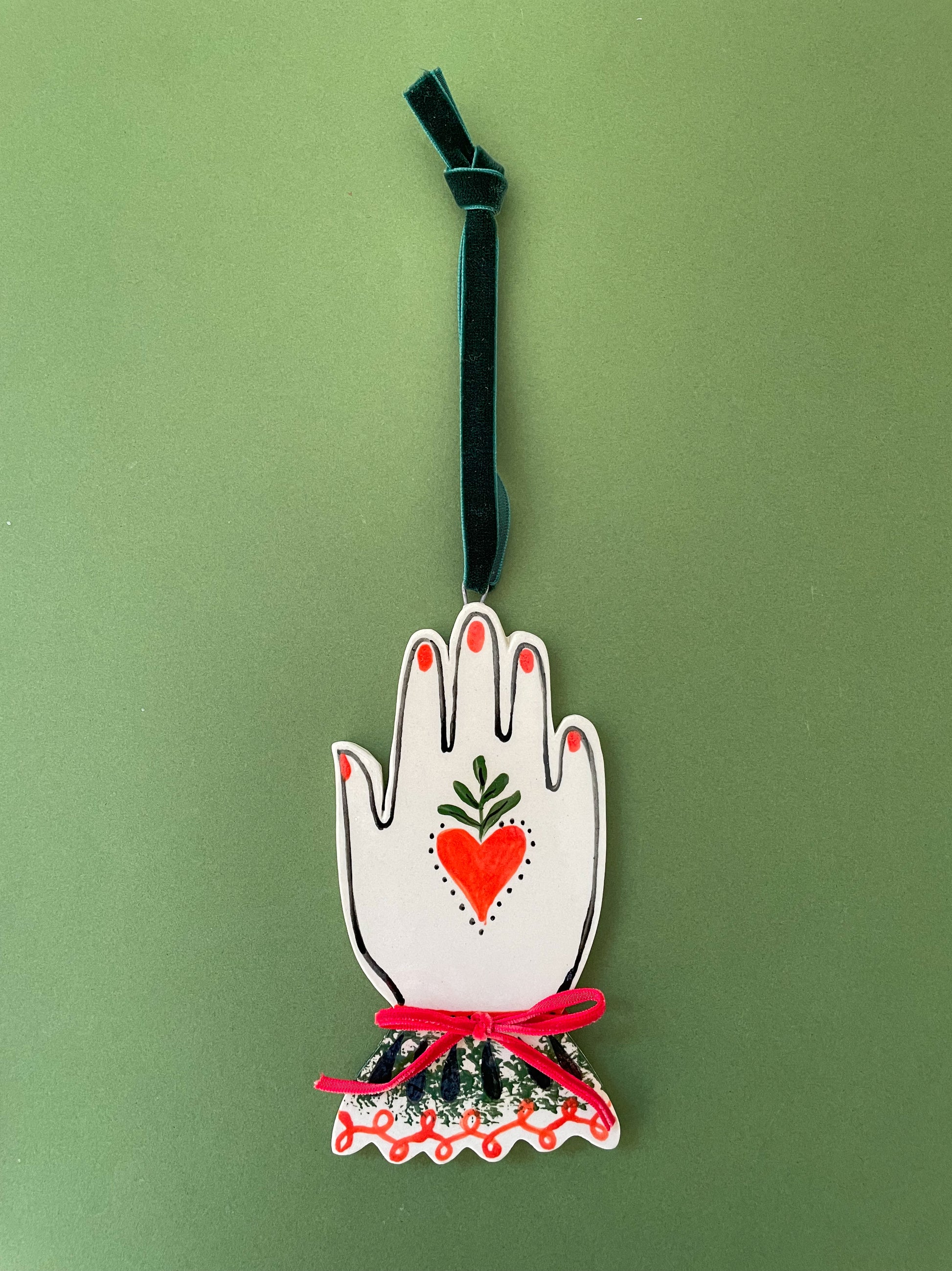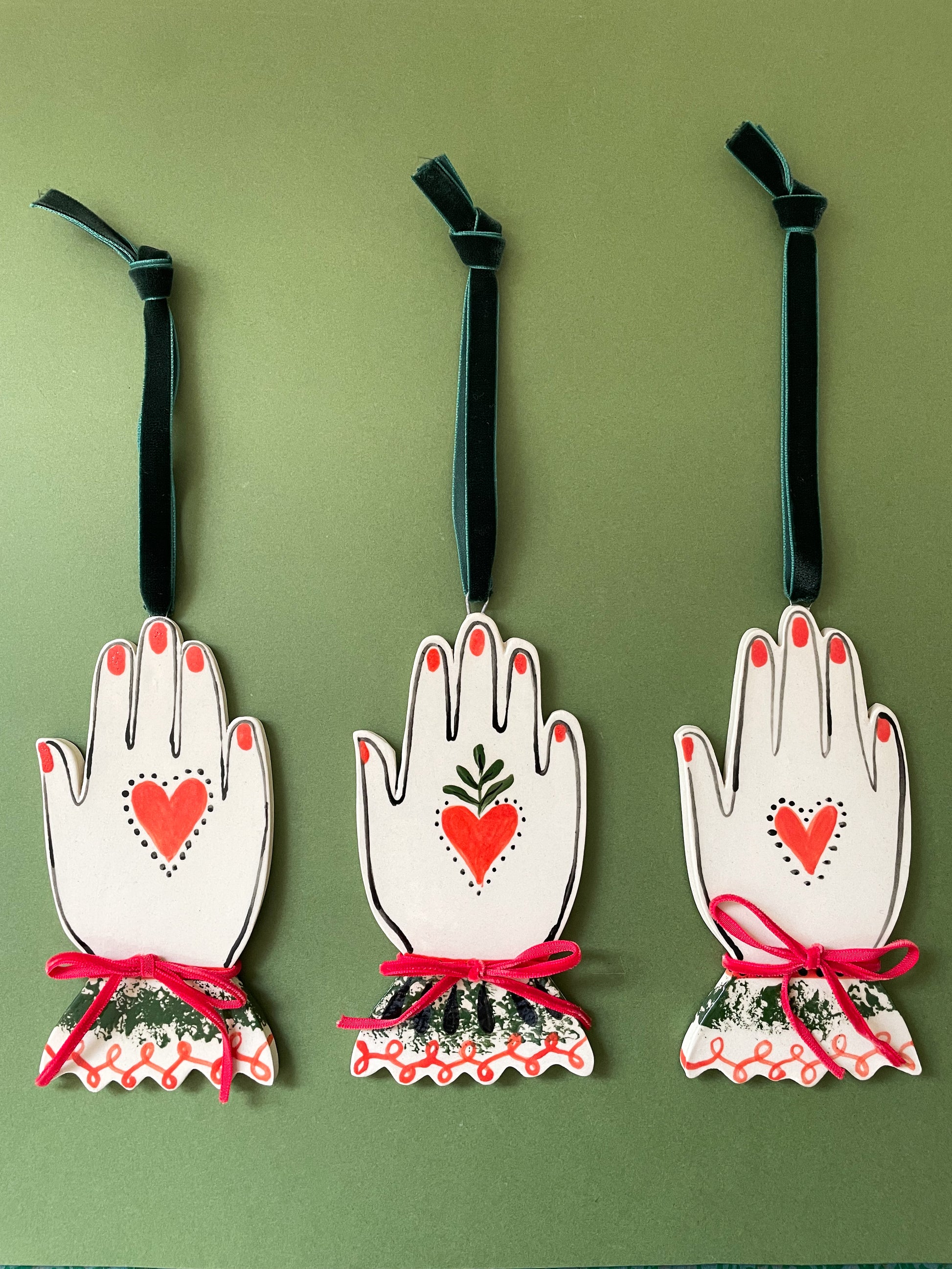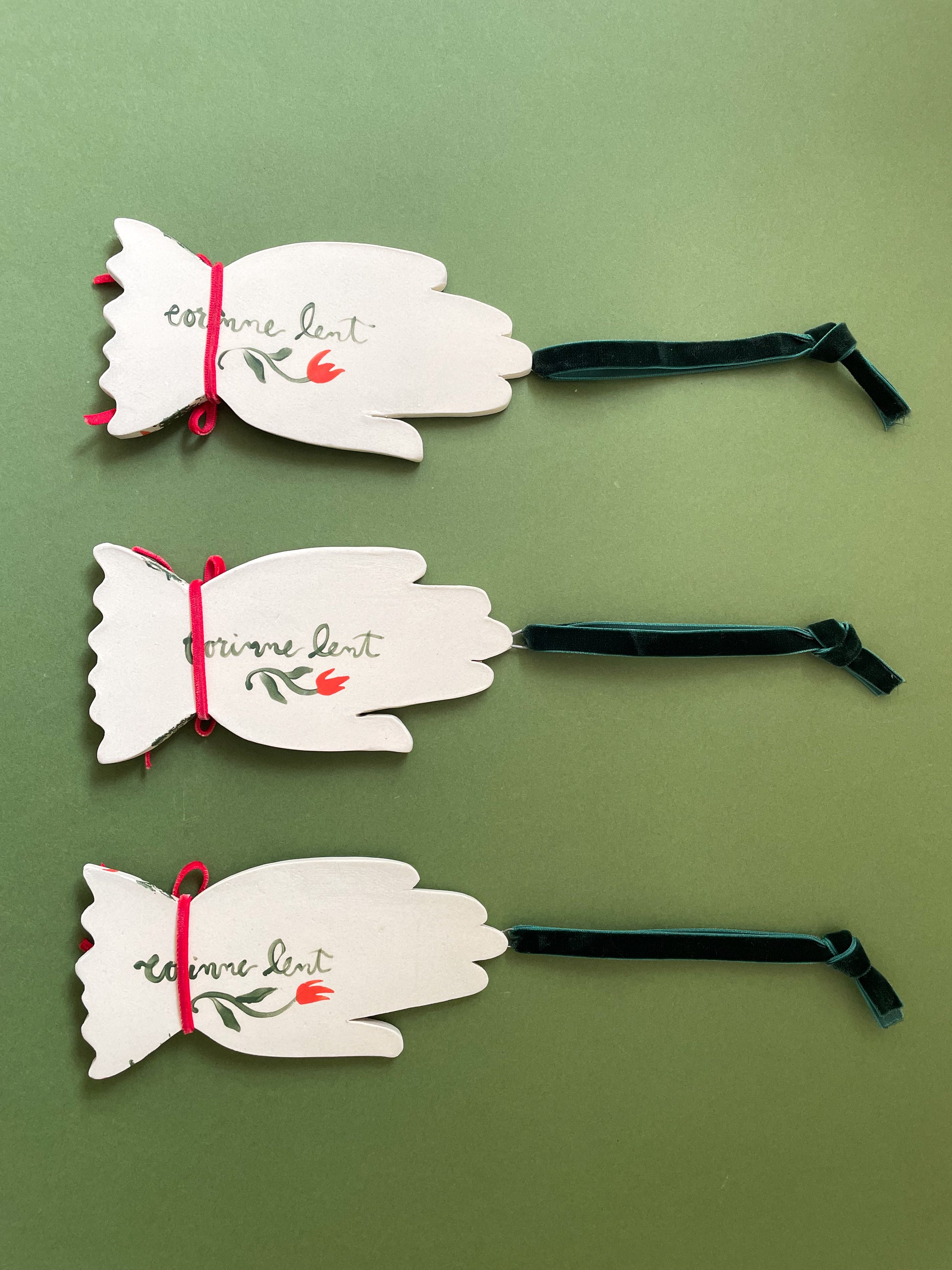 how they’re made: sculpted out of white stoneware, hand painted, glazed with a glossy clear coat and fired twice. Artist signature on the back. velvet ribbon hangers and bows attached.