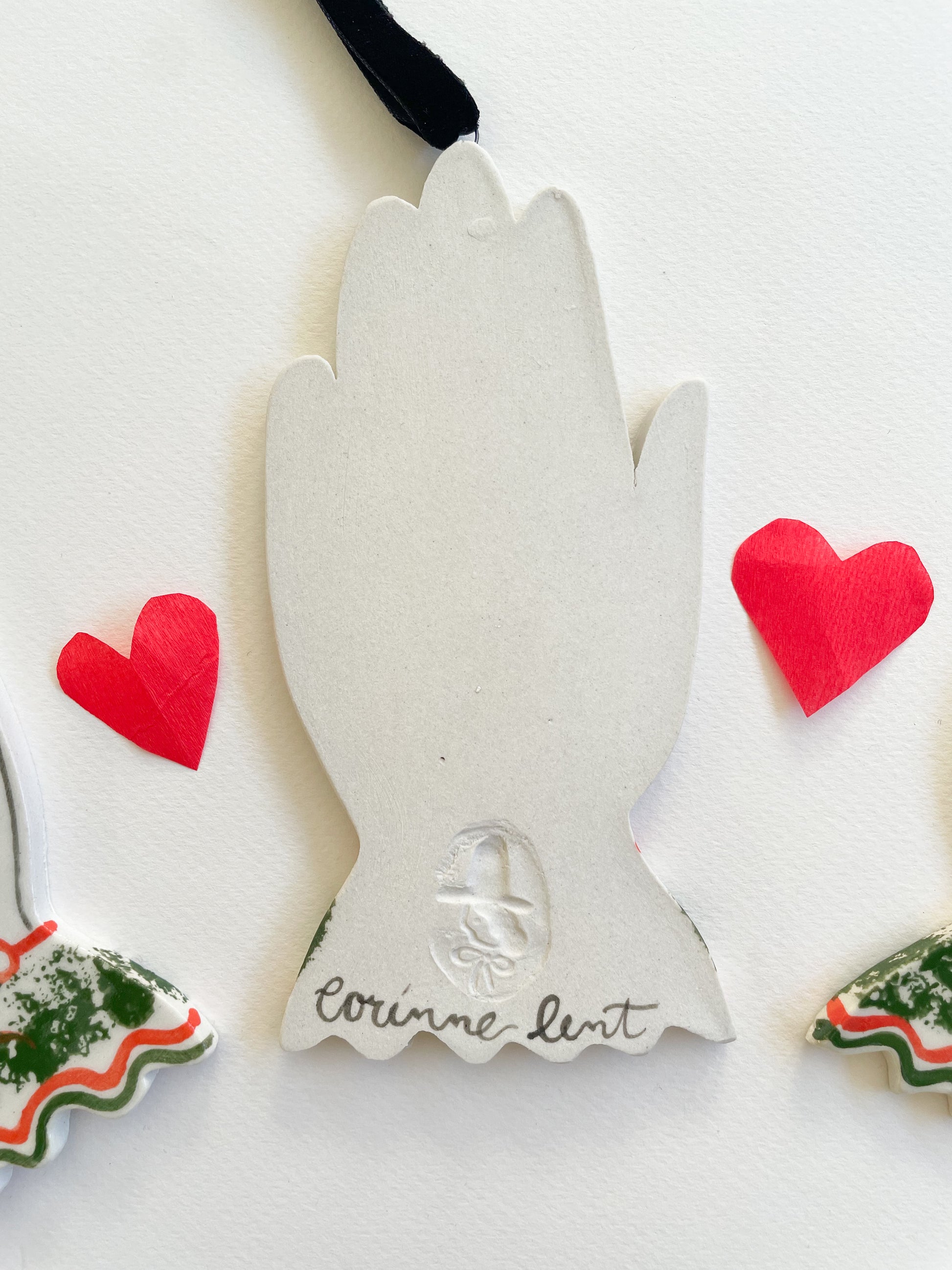 how they’re made: sculpted out of white stoneware, hand painted, glazed with a glossy clear coat and fired twice. Artist signature on the back. velvet ribbon hangers and bows attached.