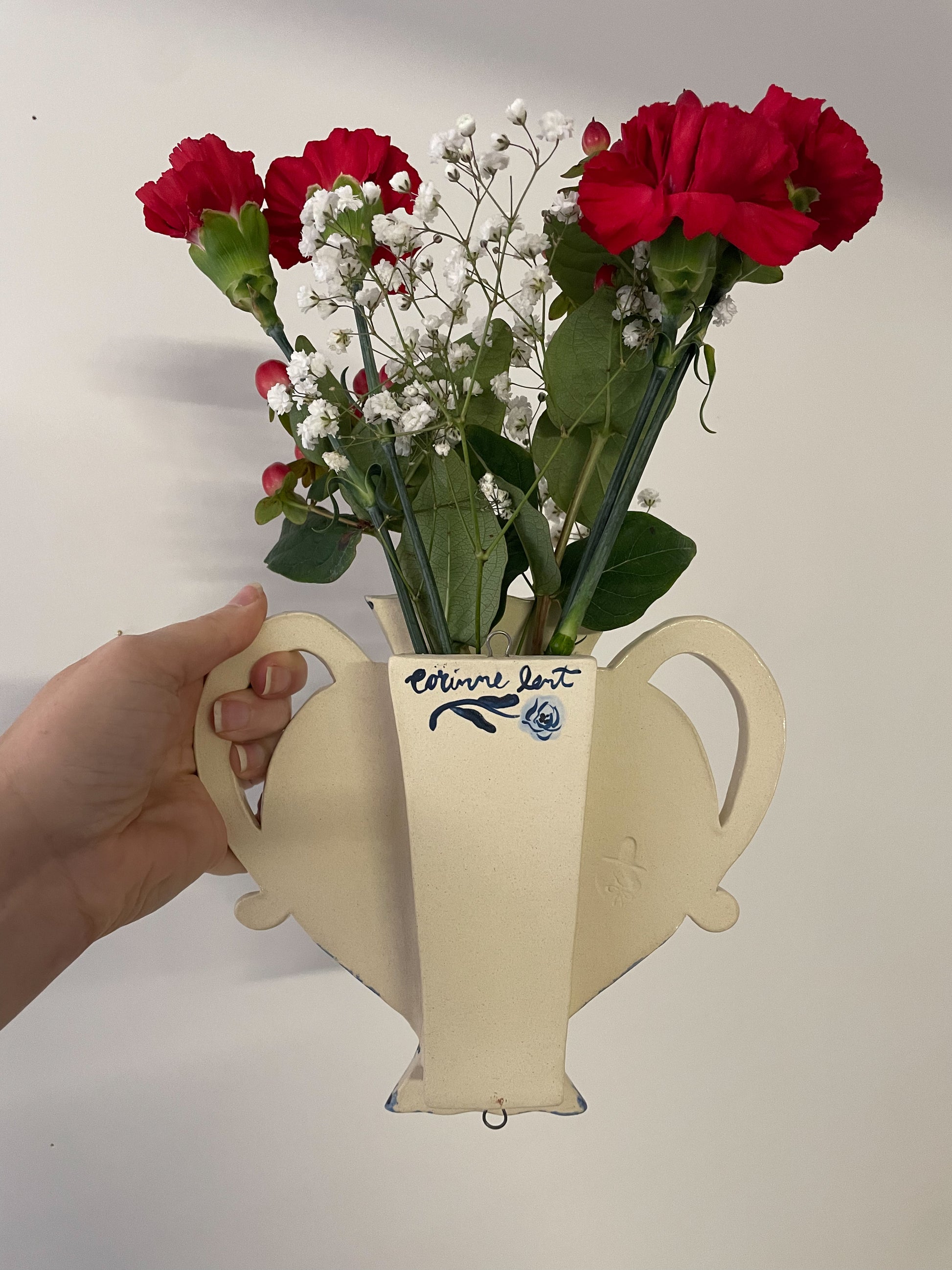 These wall vases are carefully crafted with stoneware clay and intricately painted with little folk scenes. They are a great way to add dimension to a wall gallery and display flowers or propagated plants.